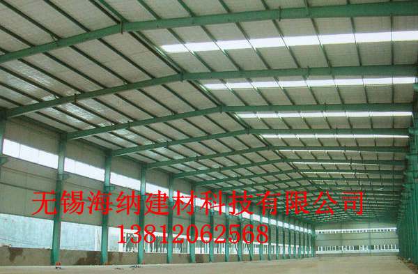 上圖中是一個很常見的廠房大棚,其中中間透光的幾條線使用的是FRP采光瓦,而不透明不透光的是塑鋼瓦材質,是這個棚頂的主要材質。塑鋼瓦單價相對較低,同時使用壽命長,所以稱為了棚頂的主要材料。但如果全是塑鋼瓦的話,廠房只靠兩端和底部進入的光線無法達到足夠的亮度,需要的話還要增加照明設備,增加了建設成本。而FRP采光瓦具有良好的透光性,且堅固內容,使用壽命可達30年。因為這簡單的幾道混合使用,大大的提高了廠房大棚內的亮度,節省了照明成本。